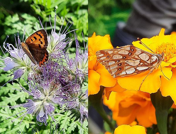 Kleine vuurvlinder (links) en Kleine parelmoervlinder