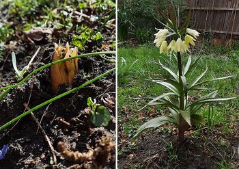 Vorig jaar liet iemand een prachtige foto zien van een grote witte fritillaria die een aanwinst zou zijn voor de tuin. Dus kocht ik dit najaar bij Peter Nijssen een bol om het eens te proberen. Ik zette deze volgens de aanwijzingen behoorlijk diep op een prominente plek, de hoek van ons gazonnetje pal voor ons raam. Een plek waar je erover zou kunnen struikelen, ware het niet dat de plant naar het schijnt net als andere Fritillaria’s ook alweer snel onder de grond verdwijnt. Na de winter was het afwachten wat de bol zou gaan doen. Heel lang was er niets te zien, totdat op 11 maart de top van de scheut door de opbollende grond brak. Door het kortdurende, maar extreem warme weer begin maart waren de eerste bloemen al open toen de stengel nog aan het opkomen was. In 10 dagen tijd groeide hij uit tot een fraaie stengel vol roomwitte bloemen. Hij lijkt wel wat op zijn neefje de keizerskroon (maar ik heb nog niets geroken), maar dan in een veel subtielere kleur.