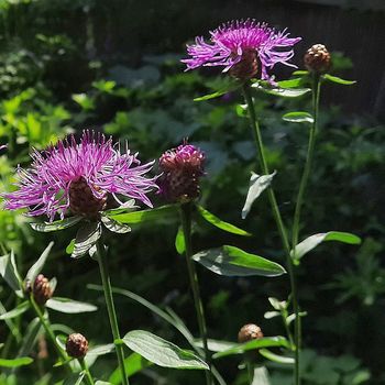 Meer inheemse planten in onze tuinen, in het belang van de biodiversiteit. Het is een bekende oproep. Maar ja, die onkruiden zijn nou niet bepaald mooi, toch? Nou, dat valt wel mee. Neem bijvoorbeeld het gewone knoopkruid, Centaurea jacea. Een lila neefje van de fraaie korenbloem (Centaurea cyanus). Deze plant staat altijd zo mooi te bloeien in de berm van de Rooseveltweg dat ik een paar jaar geleden zaad ervan meenam naar huis. Ik kreeg drie zaailingen, die het in het begin moeilijk hadden, want ze werden snel gevonden door een vlindertje waarvan de rupsen van het blad aten. Dit overleefden ze, en daarna gingen ze bloeien. Zo mooi dat ik ze in onze voortuin zette, maar daar was te weinig zon denk ik, zeker in het natte jaar 2024. Ik zag ze er niet meer terug. Gelukkig hadden ze zich uitgezaaid op de zonnige plek waar hun potten hadden gestaan, en dus stond er deze zomer een mooi bosje knoopkruid in bloei langs de rand van ons gazon annex bloemenweitje. Inmiddels zijn ze uitgebloeid en heb ik ze afgeknipt, maar er zijn alweer nieuwe jonge scheutjes gevormd. Er komt dus nog meer. Op onze ruilbeurs kun je de zaden vinden, en anders bij Cruydt Hoeck, die ook de Grote centaurie (Centaurea scabiosa) in het sortiment heeft. Deze zou nog mooier zijn. De zaailing van deze grotere soort staat op de Eng in het zonnetje en doet het daar prima, vooralsnog zonder bloemen. Ik ben benieuwd.