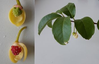 foto: Kadsura japonica met opengemaakte vrouwelijke (groen) en mannelijke (rood) bloemen