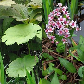 foto: Darmera peltata, bloemen op 22 april en blad in de zomer