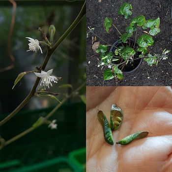 foto: Beesia calthifolia, bloemetjes, zaadpeultjes met zaden en mijn plant in een pot in de kas