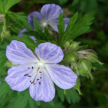 De witgeaderde vorm is een cultuurselectie van de effen lila bloeiende beemdooievaarsbek (Geranium pratense) die inheems is. Onze bestuivers weten er daarom wel raad mee en ik zie dan ook veel bijen op de bloemen vliegen. Een echte aanrader!