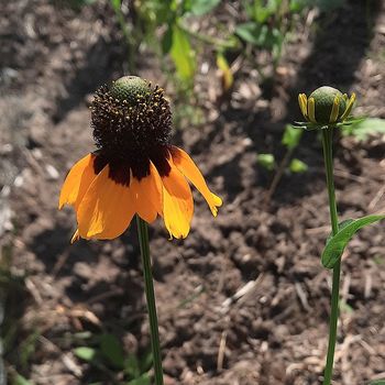 Op zoek naar een plant die het goed zou doen op droge zandgrond in de volle zon kwam ik uit bij de Mexicaanse zonnehoed, Ratibida columnifera. Het zaad was op internet snel gevonden. Ze zijn er in diverse warme kleuren van geel tot rood, ik nam de gele met een bruine ring in het hart. Deze zaaide ik op 20 maart binnen voor, 3 weken later kon ik ze verspenen en na half mei zette ik ze in de volle grond bij onze moestuin op De Eng. In het begin gaf ik ze wat water, maar daarna moesten ze zichzelf redden. En dat deden ze vol overtuiging. Al gauw verschenen de eerste bloemen, en ze bloeien door tot op vandaag. De bloemen lijken inderdaad op Mexicaanse zonnehoeden, een hoge bruine kegel met daaromheen een krans van gele bloemblaadjes. Ze staan op hoge, dunne stengels die verrassend goed rechtop blijven staan. En ze worden veel bezocht door bijen en hommels. De bloemen zijn na enkele weken uitgebloeid. Je kunt ze natuurlijk terugknippen voor een langere bloei, maar dat deed ik niet want de bruine kegels zitten vol met zaad, en ik wil dat ze zich gaan uitzaaien. En natuurlijk veel zaad opleveren voor de zadenruilbeurs komende januari. Steeds als ik er kom neem ik daarom wat van die papieren zaadzakjes mee. Er verschijnen steeds nieuwe bloemen, totdat de plant genoeg zaad heeft gevormd en afsterft. Kortom, een leuke en makkelijke plant voor een zonnig en droog hoekje.